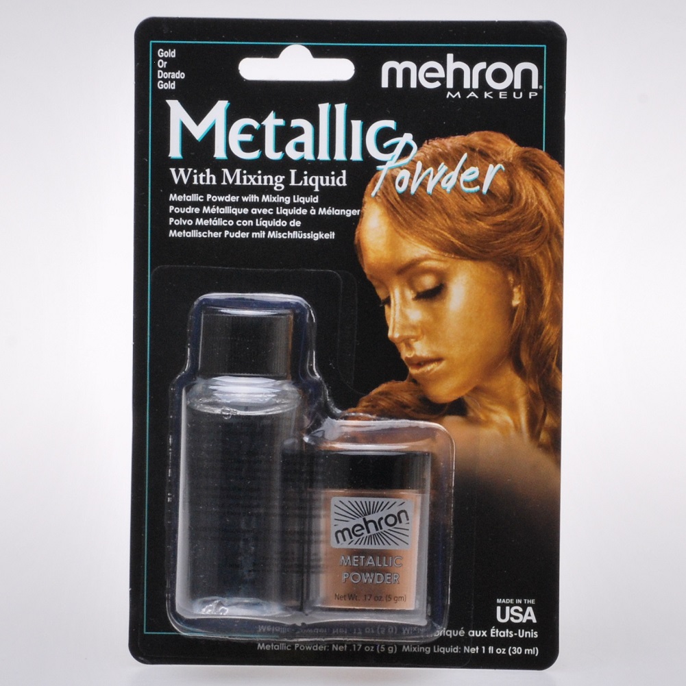 Mehron Metallic Powder is an ultra-fine loose powder pigment that is made for creating dramatic, high-shine metallic designs. Use the loose powder on its own to create soft metallic accents or mix with Mehron Mixing Liquid to transform Metallic Powder into a long-wear, transfer-resistant liquid metal paint. By adding Mixing Liquid, Metallic Powder turns into an intense molten liquid makeup that can be painted onto the body or used to create designs like metallic eyeliner.