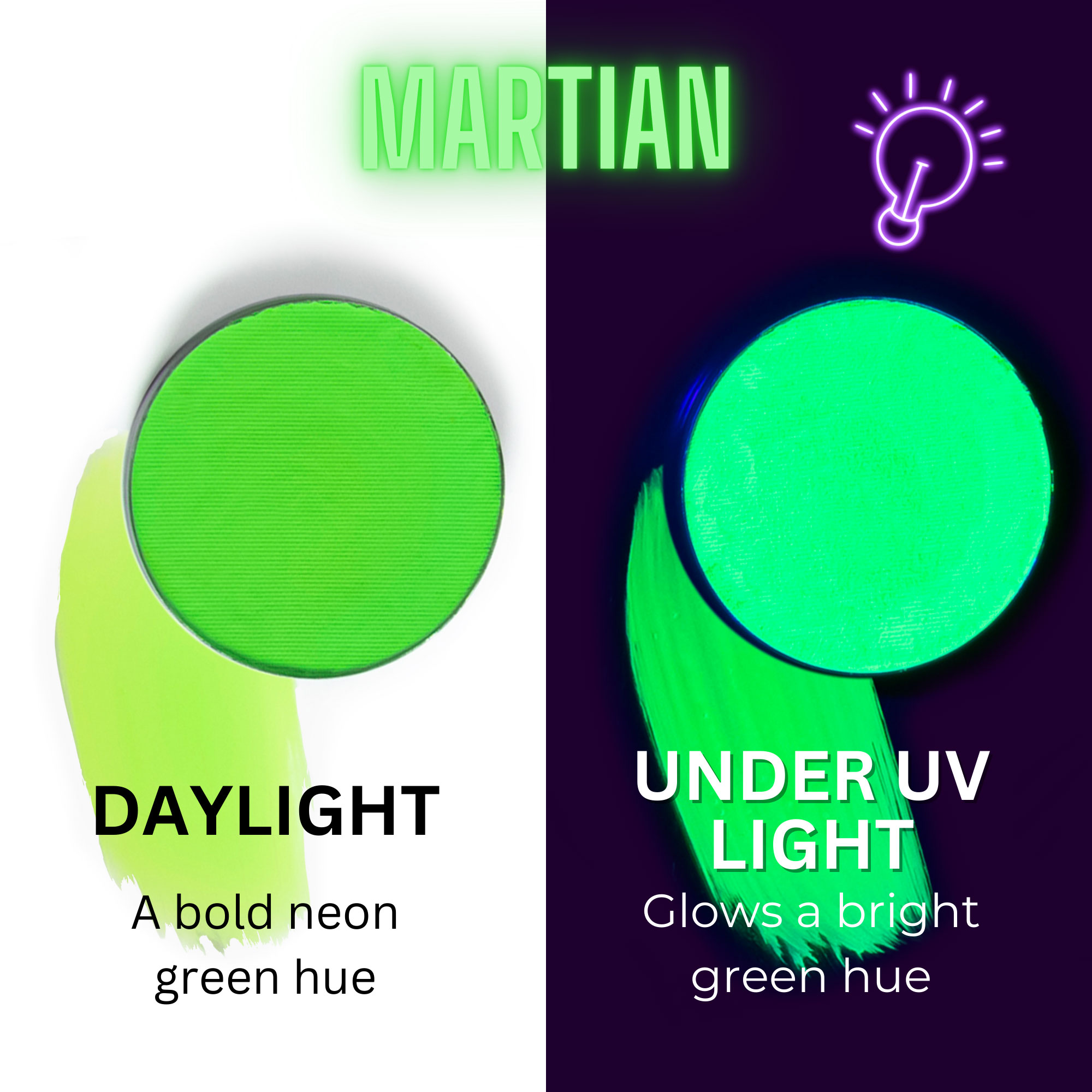 Mehron’s world famous, premium quality, water-based fx paint (refill size, 7 grams). Our Metallic collection contains highly pigmented, shimmering metallic hues and our Neon UV Glow shades provide bold color in daylight and a bright colorful glow under UV light.